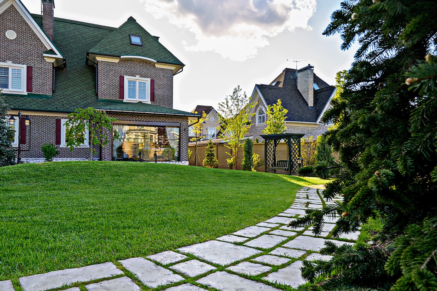 Важно было организовать несколько зон для отдыха и встреч, гармонично вписать архитектурные элементы и превратить сложный рельеф в преимущество, сделав пространство визуально более объёмным и уютным.